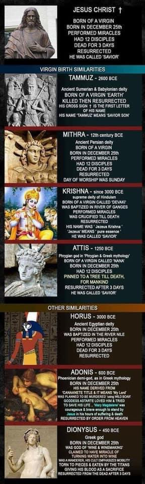 Proof of Mythology? I’ll Bet you didn’t know that there were many Gods that were born by a virgin on December 25th, was crucified n rose again, 3000 years Before Christ? Including Adonis n Krishna n Hercules n Buda.